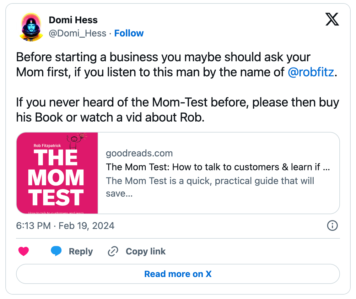 This book is my number #1 tip. I always recommend Rob, if someone is telling me about an idea and being not sure. That’s the main method I use to test all business ideas, weather at work or for myself.