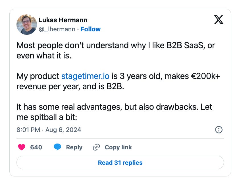 The point I like the most is, businesses pay to solve their problems. B2C Customers hate you if you raise from 8.99€ to 9.99€.