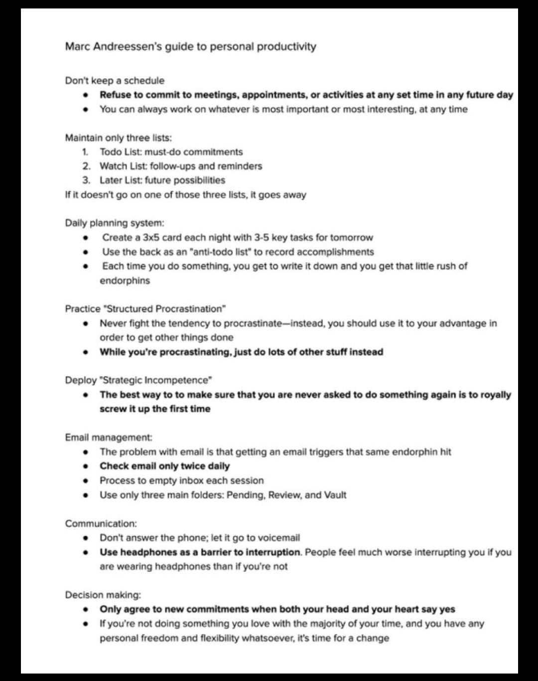 The “Three Lists” idea, is probably Marc’s version of the Eisenhower matrix. But my favourite one is definitely “…deploy strategic incompetence…”.