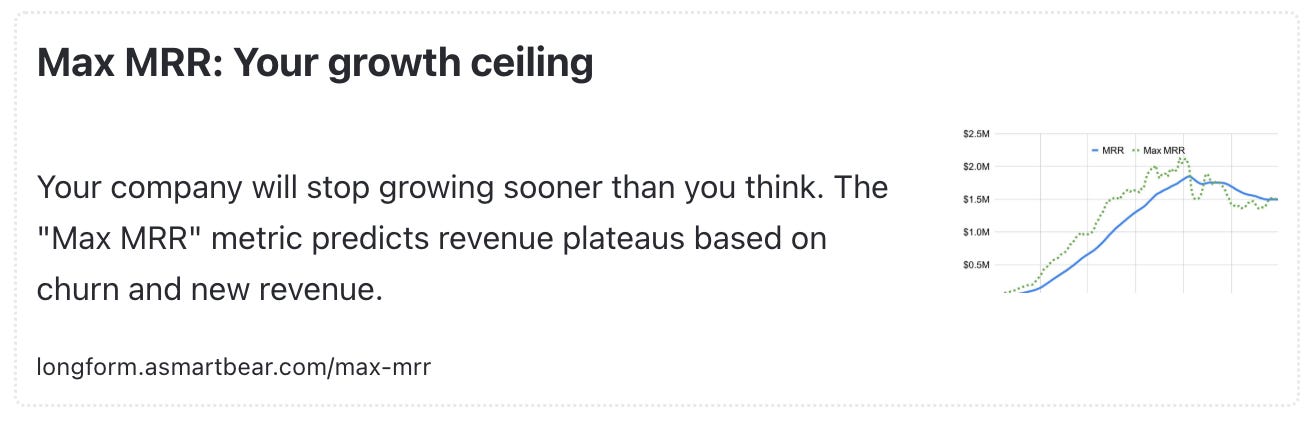 Jason Cohen's Max MRR metric brilliantly demonstrates this principle. While founders celebrated steady revenue growth, the Max MRR curve predicted the inevitable plateau months ahead. (read his article, I promise worth your time)
