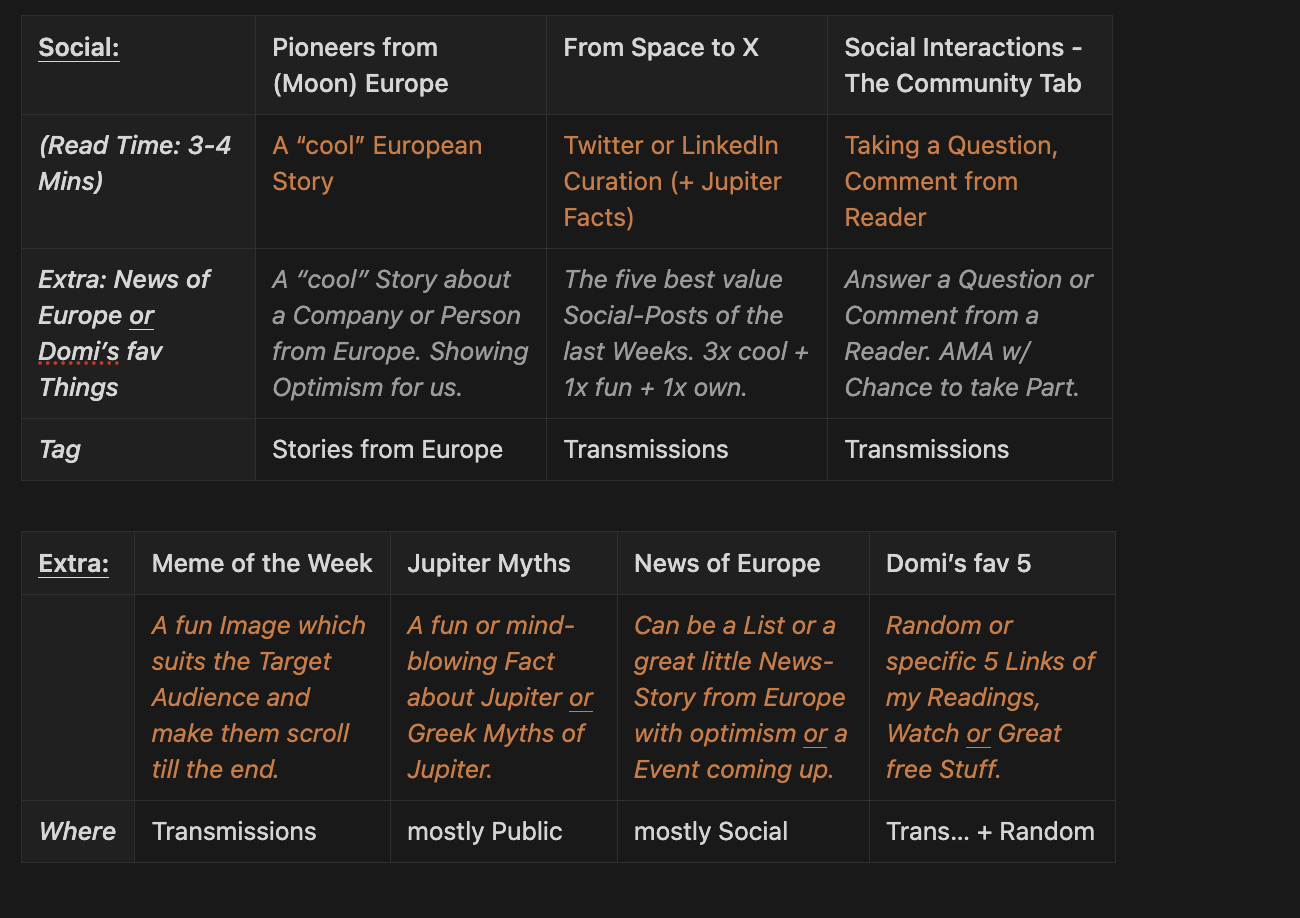 As you may recognised, behind every section idea, is a clear value proposition to deliver useful content for european entrepreneurial thinkers. And thanks to the posting schedule, I can test different topics and different forms of content in an one-month-cycle.